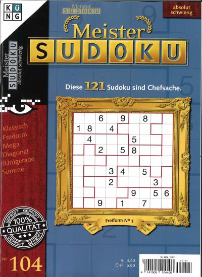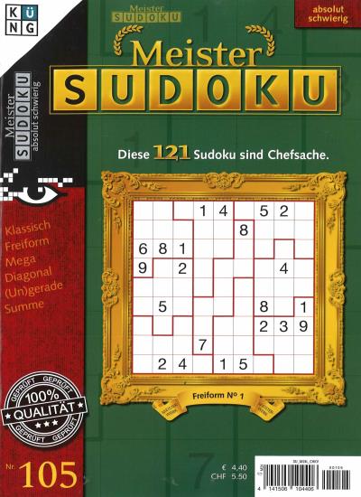 Für alle Rätselfreunde, denen das PROFI und KNIFFEL SUDOKU zu einfach ist, erscheint jetzt mit gleicher hochwertiger Aufmachung und aus dem gleichen Verlagshaus das MEISTER SUDOKU. Ein absolut schwieriges Sudoku Rätsel mit Anleitung.
