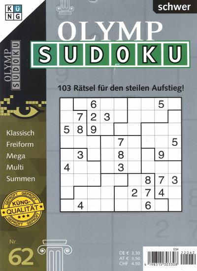 Sie erhalten OLYMP SUDOKU ab der nächst erreichbaren Ausgabe zum Heftpreis von zur Zeit 4,40 € (inkl. MwSt. und Versand). OLYMP SUDOKU erscheint zur Zeit 6 x im Jahr. Sie erhalten im Jahresabonnement 6 Ausgaben.