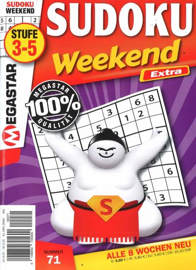 Sie erhalten SUDOKU WEEKEND EXTRA ab der nächst erreichbaren Ausgabe zum Heftpreis von zur Zeit 5,70 € (inkl. MwSt. und Versand). SUDOKU WEEKEND EXTRA erscheint zur Zeit 6 x im Jahr. Sie erhalten im Jahresabonnement 6 Ausgaben.